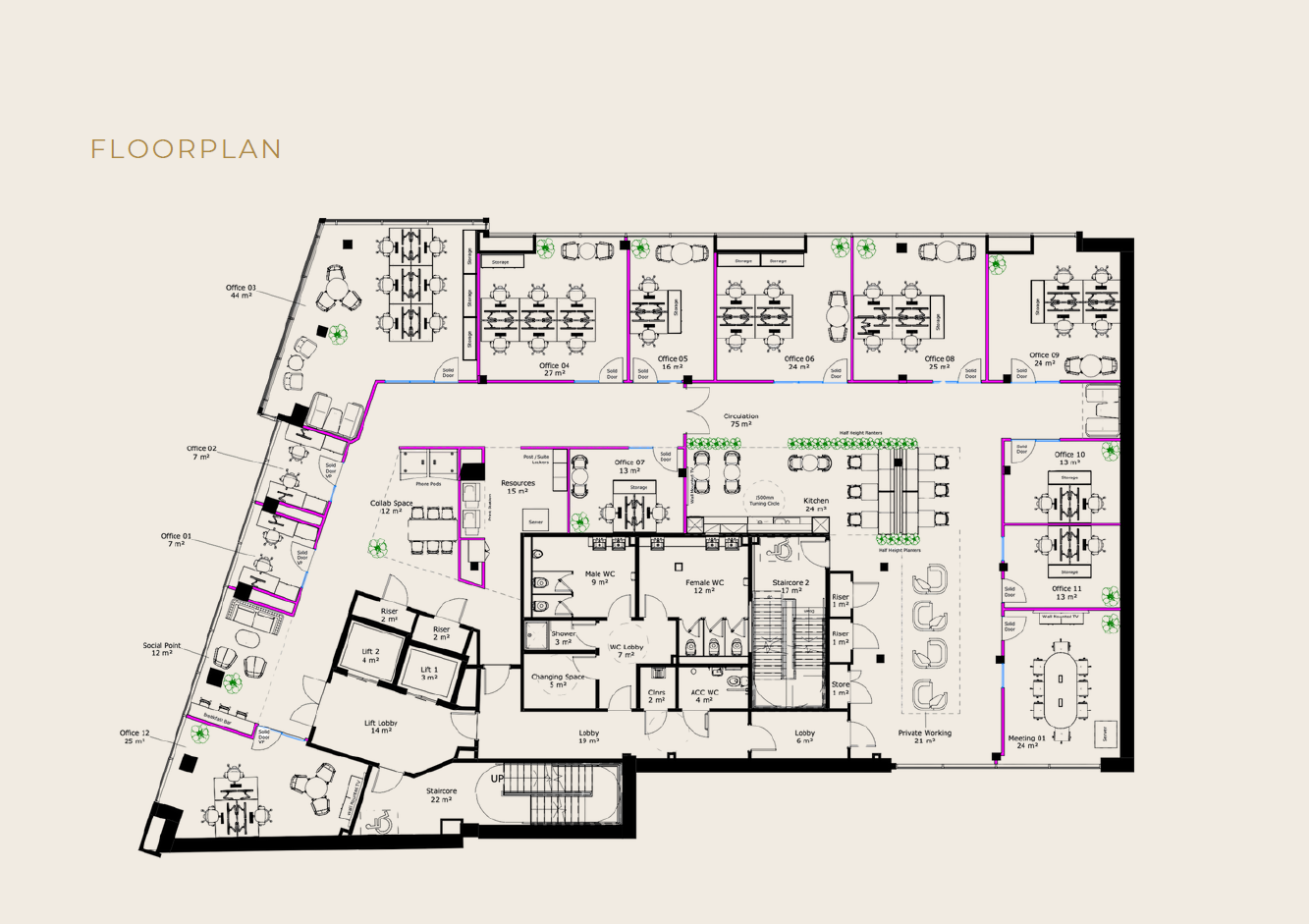 A range of private serviced offices from 1 person spaces to larger suites, designed to support future growth. Internal and external specification and elevation treatments may be subject to alterations.