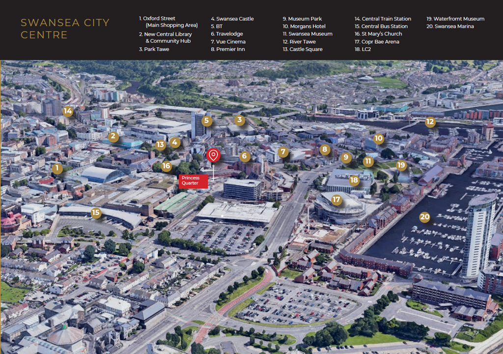 Princess Quarter occupies a prominent position within the heart of Swansea city centre. Situated on the corner of Princess Way and St. Mary Street, the property is located within the City’s main business district and benefits from immediate access to amenities including shops, restaurants, gyms and hotels. The